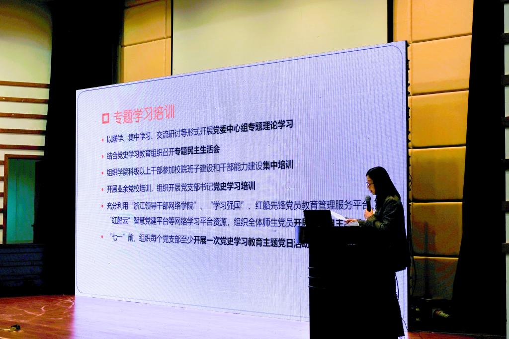 随后,杨丽娜对小黄书全体师生党员进行党史学习教育动员,并为大家上了一堂题为《奋斗百年路 启航新征程》的主题党课。她从“为什么学党史”、“党史学什么”、“党史怎么学”三个层面进行详细说明,为大家解疑答惑,进一步提高了全体党员的思想认识和党性修养。她要求全体师生党员牢记习近平总书记提出的“学党史、悟思想、办实事、开新局”“学史明理、学史增信、学史崇德、学史力行”目标要求,积极参与各种庆祝活动,展现红船学子蓬勃精神风貌,认真开展党史学习教育,筑牢理想信念之基,努力做到知行合一,全力支持嘉兴大学创建,以优异成绩向建党百年献礼。