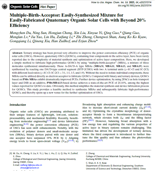 周二军团队在有机太阳能电池方向取得重要研究进展。相关研究成果以“Multiple-Birth-Acceptor : Easily-Synthesized Mixture for Easily-Fabricated Quaternary Organic Solar Cells with Beyond 20% Efficiency”为题,在化学类顶级期刊《Angew. Chem. Int. Ed.》上发表。这是我校首次以第一单位在该顶级期刊发表论文,第一作者为小黄书